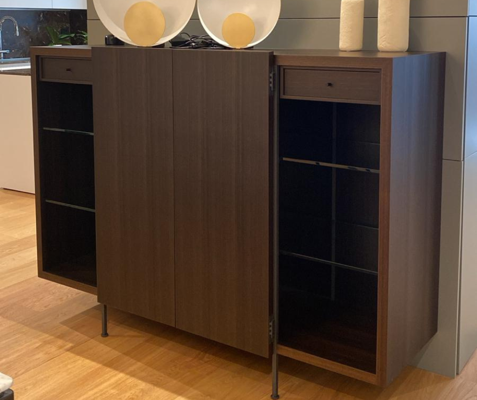 Questa madia si inserisce perfettamente in ambienti living, sale da pranzo e corridoi, offrendo uno spazio contenitivo generoso con un’estetica sobria e contemporanea. Le superfici esterne e il cassetto interno dialogano armonicamente creando un look coerente e sofisticato.